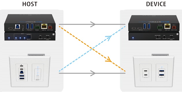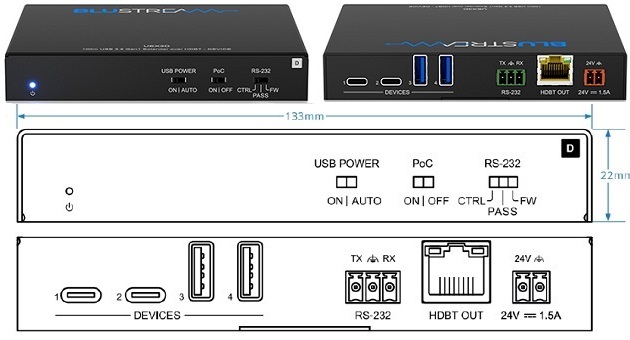デバイス側ユニットには2系統USBタイプCと2系統USBタイプAポートを搭載。ホスト側で選択されているPCと接続します。またデバイス側のUSBポートは4ポート合計で最大5V/3Aまでのデバイス給電に対応し、PTZカメラやストレージなどの動作にも十分な電力を供給できます。