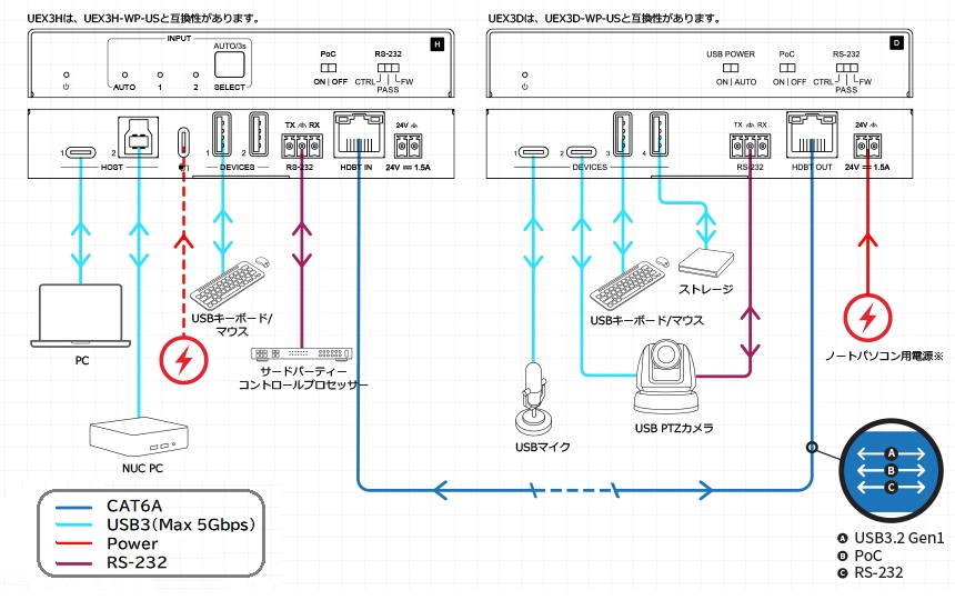 UEX3シリーズはUSB3.2 Gen1データ信号を最長70mまで延長できるUSBエクステンダーです。ホスト側ユニットとデバイス側ユニットに分かれており、CAT6A以上のLANケーブル1本でユニット間を接続し、HDBaseT技術によりUSB信号とRS-232信号を延長します。