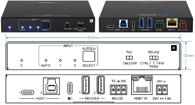 デバイス側ユニットには2系統USBタイプCと2系統USBタイプAポートを搭載。ホスト側で選択されているPCと接続します。またデバイス側のUSBポートは4ポート合計で最大5V/3Aまでのデバイス給電に対応し、PTZカメラやストレージなどの動作にも十分な電力を供給できます。